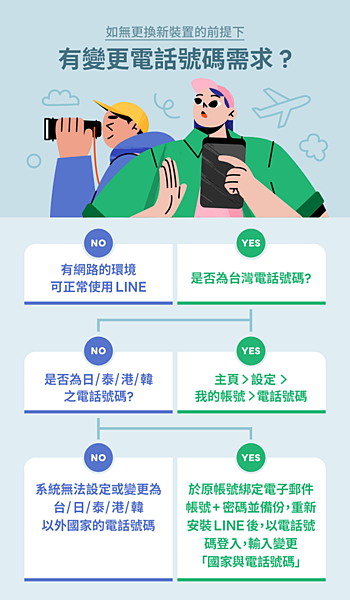 若更改的電話號碼不是日、泰、港、韓,目前LINE系統無法設定或變更為台灣日本、泰國、香港、韓國以外國家的電話號碼。