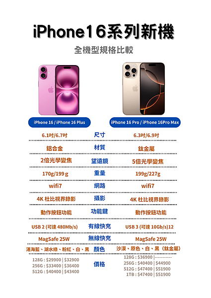 ●iPhone 16 Pro Max:超頂規旗艦機型,具備 Pro 系列特色、螢幕尺寸更大與續航超長。